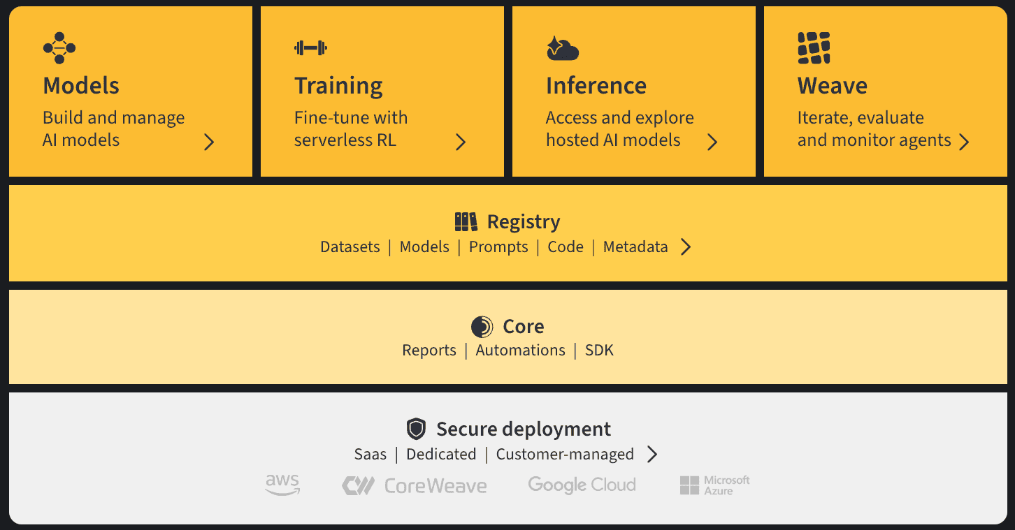 Weights & Biases (W&B) は、AI 開発者向けのプラットフォームで、モデルのトレーニング、ファインチューニング、および基盤モデルの活用のためのツールを提供しています。