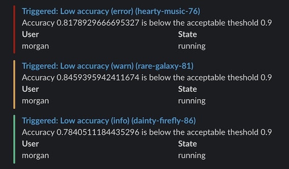 このシンプルなアラートは、精度が閾値を下回ると警告を送信します。この例では、少なくとも 5 分おきにアラートを送信します。ユーザーをタグ付けまたはメンションする方法