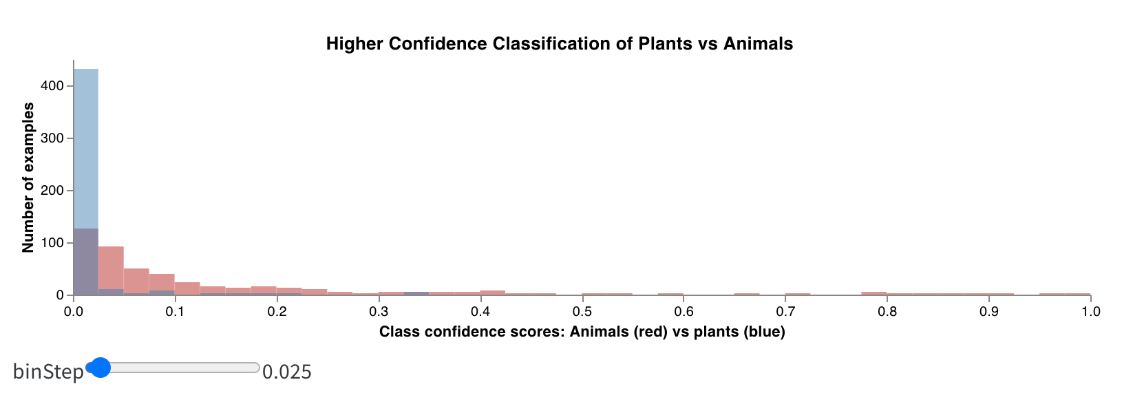히스토그램은 숫자 분포를 시각화하여 더 큰 데이터셋을 이해하는 데 도움을 줄 수 있습니다. 합성 히스토그램은 동일한 bin에서 여러 분포를 보여주어 서로 다른 모델 간 또는 모델 내의 서로 다른 클래스 간에 두 개 이상의 메트릭을 비교할 수 있습니다. 운전 장면에서 오브젝트를 감지하는 시멘틱 세그멘테이션 모델의 경우 정확도 대 IOU (intersection over union)에 대해 최적화하는 효과를 비교하거나 서로 다른 모델이 자동차 (데이터에서 크고 일반적인 영역) 대 교통 표지판 (훨씬 작고 덜 일반적인 영역)을 얼마나 잘 감지하는지 알고 싶을 수 있습니다. 데모 Colab에서는 10가지 생물 클래스 중 2가지에 대한 신뢰도 점수를 비교할 수 있습니다.