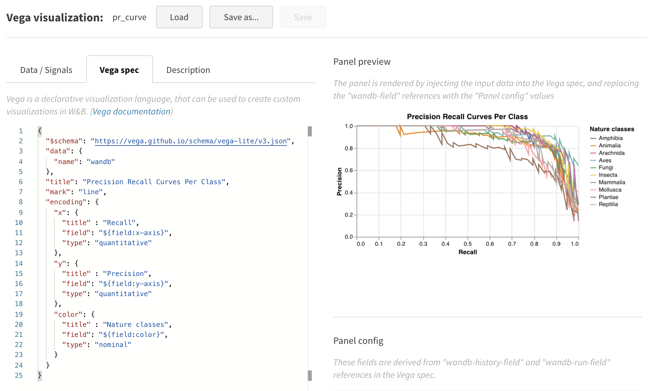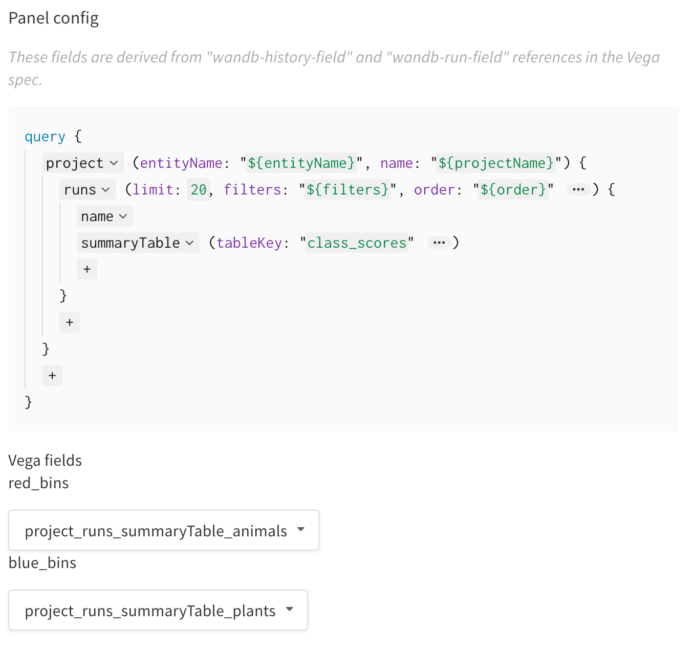 summaryTable을 추가하고 해당tableKey를class_scores로 설정하여 run에서 기록한wandb.Table을 가져옵니다. 이렇게 하면 드롭다운 메뉴를 통해wandb.Table이class_scores로 기록된 열과 함께 두 개의 히스토그램 bin 세트 (red_bins및blue_bins)를 채울 수 있습니다. 내 예제에서는 빨간색 bin에 대한animal클래스 예측 점수와 파란색 bin에 대한plant를 선택했습니다. - 미리 보기 렌더링에서 보이는 플롯이 마음에 들 때까지 Vega 사양과 쿼리를 계속 변경할 수 있습니다. 완료되면 상단의 Save as를 클릭하고 나중에 재사용할 수 있도록 커스텀 플롯 이름을 지정합니다. 그런 다음 Apply from panel library를 클릭하여 플롯을 완료합니다.