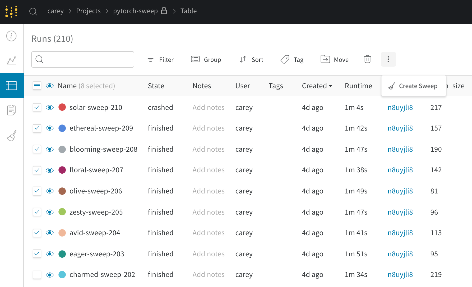 이전에 기록한 기존 run을 사용하여 새 스윕을 시작합니다.- 프로젝트 테이블을 엽니다.